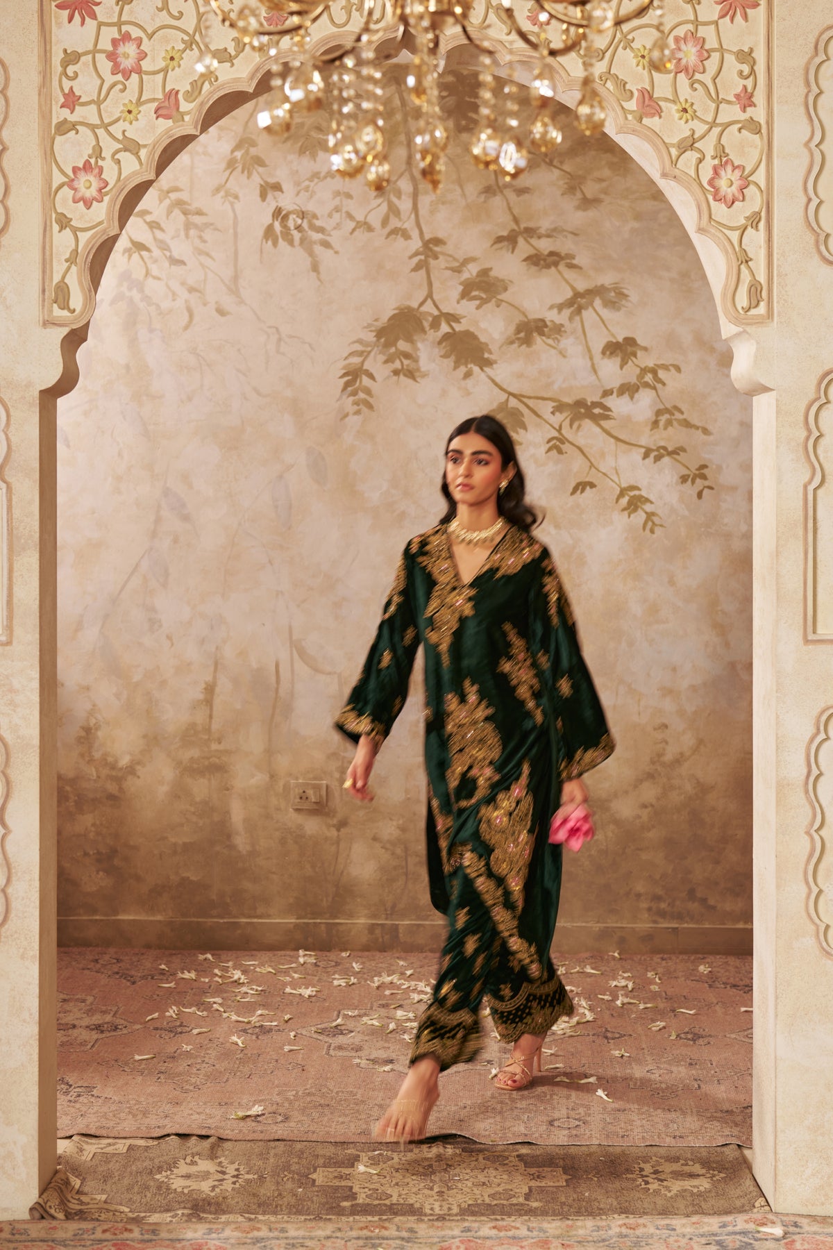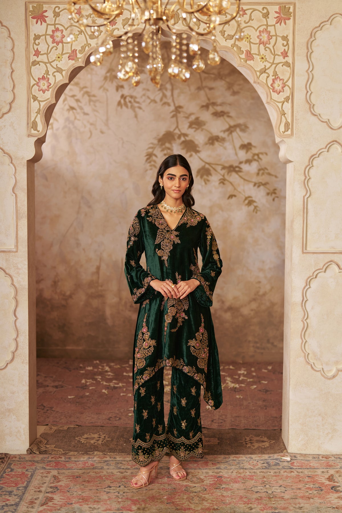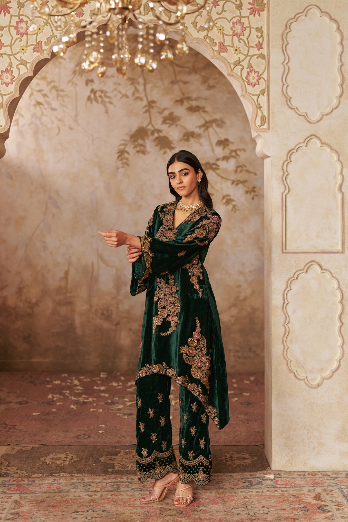 A premium bottle green velvet ensemble, designed to exude elegance and festivity. The rich velvet fabric and flattering silhouette make it perfect for weddings, parties, or special occasions where sophistication is key.
