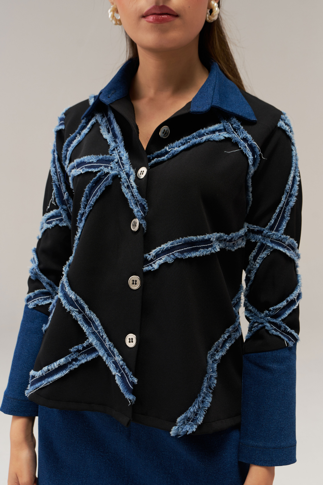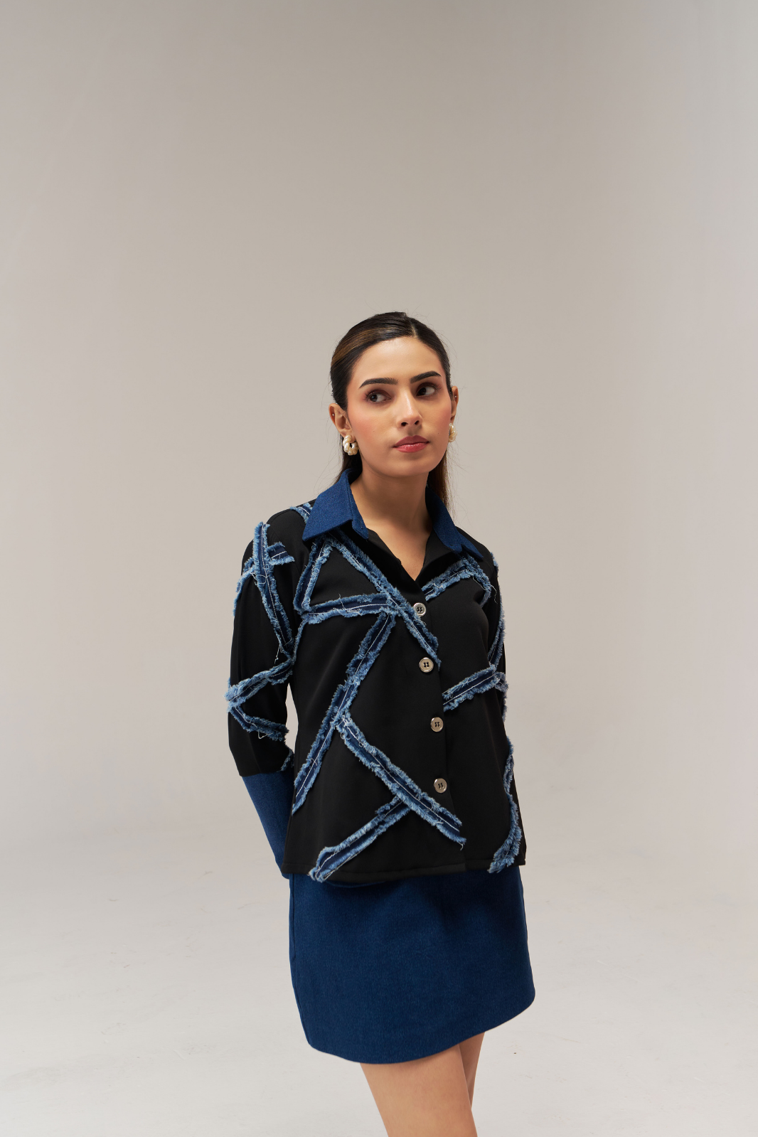 A black crepe shirt detailed with washed denim strip accents, complemented by a denim collar and denim sleeve hems for a structured contrast. Paired with a clean-cut denim skirt, the set blends sharp tailoring with contemporary texture.