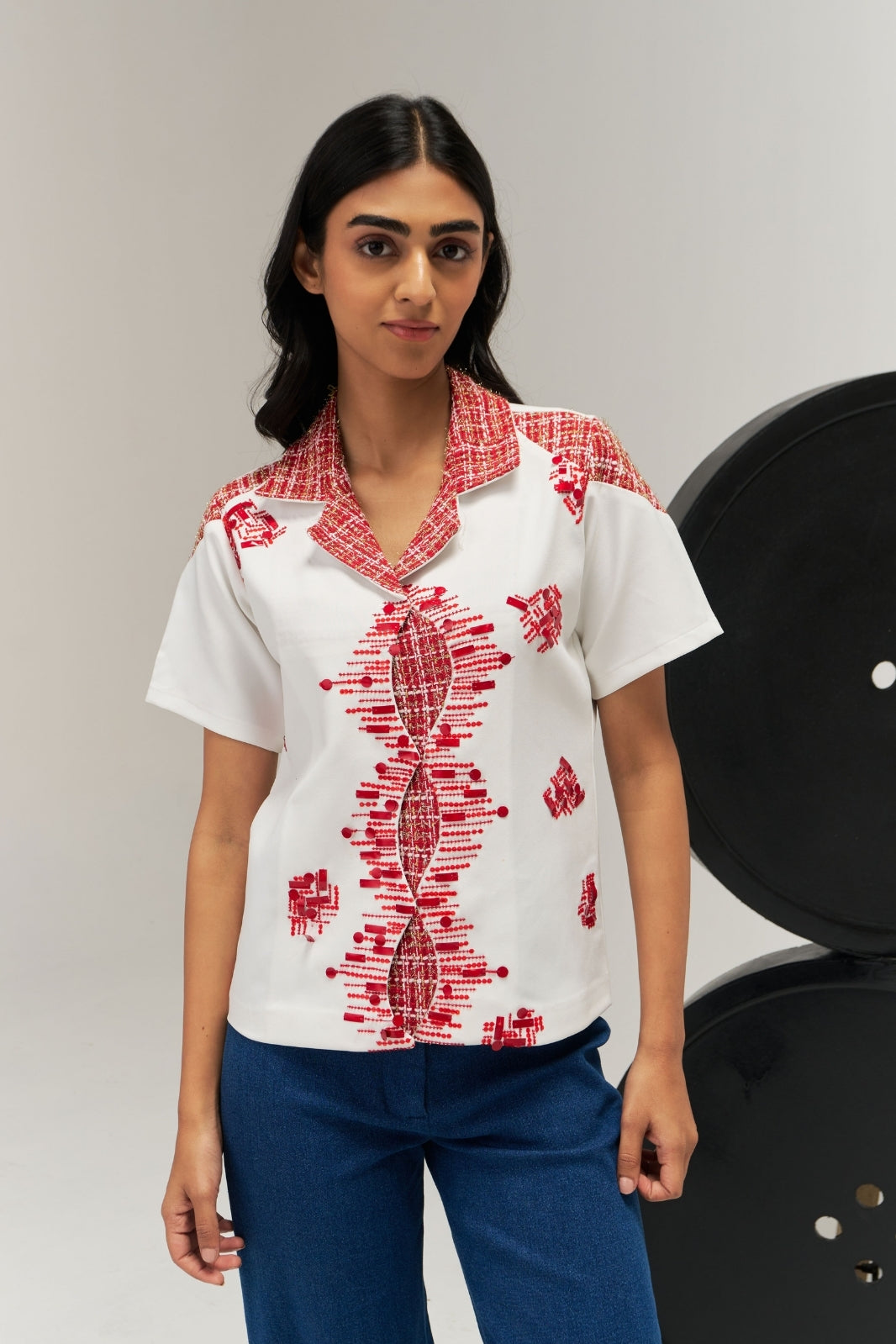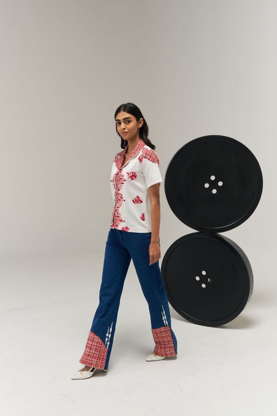 A modern co-ord set featuring a white shirt with tweed detailing, hand embroidery, and a graphic scallop-pattern opening. Paired with blue denim pants finished with tweed patches and embroidery, this set offers effortless style with crafted details.